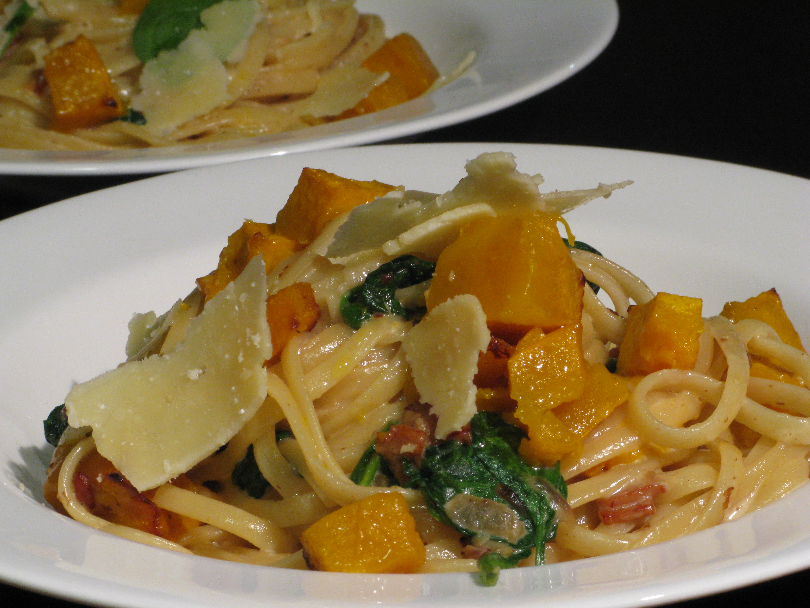 Put on a pot of water, salt lightly and bring to the boil. Cook the pasta until al dente. Just before the pasta is cooked, add the cream and the spinach to the bacon mixture and reduce slightly over medium heat. Drain the pasta and add it to the sauce with the roasted pumpkin. Top with the shaved parmesan and freshly ground black pepper and serve immediately.
