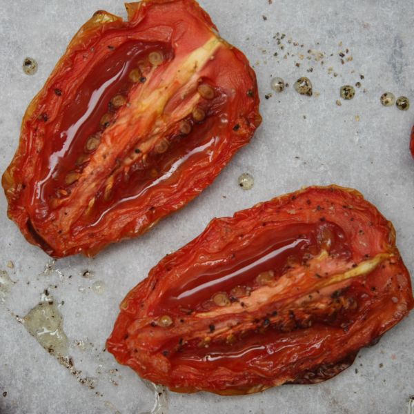 Slice the tomatoes in half lengthwise. Lay them in a single layer on a baking tray lined with silicone paper. Sprinkle with salt and pepper and drizzle the olive oil over the top. Place in an oven that has been preheated to 140 degrees celsius and roast for 45 minutes – 1 hour depending on how big the tomatoes are. They need to be very soft but still holding their shape and not over browned to ensure that all the sweet flavours of the tomatoes have had time to develop fully.
