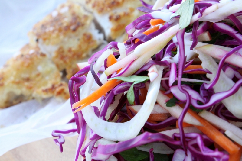 This recipe is my take on American southern fried chicken, where chicken pieces, usually on the bone, are marinated in buttermilk, coated with crumbs and deep fried. I’ve gone for a much lighter approach by pan frying in a little oil and butter, but used the buttermilk, along with whole-grain mustard, to marinate chicken breasts, and Japanese panko breadcrumbs as my coating. The result is almost unbelievably tender chicken, and the subtle aniseed-like fennel and sweet apple in the slaw are a food marriage made in heaven. I’ve come slowly towards fennel, as in my childhood, aniseed was a studiously avoided flavour. I was the child who peeled off the layers of licorice in licorice all-sorts and left them for my father to eat, while gobbling up the sweet candy layers. Ouzo is still a bridge too far, but a baby fennel bulb, sliced very thinly, is now a taste I adore. The dressing on the slaw is also very light and uses buttermilk and Greek yoghurt rather than mayonnaise, so no guilt is necessary. If you are making ahead, don’t add the dressing until just before serving. The purple cabbage will share its colour with the dressing and turn it a pinky-purple. Pretty, but it’s nice to see all the bright colours of the carrot and parsley as well as the deep purple cabbage. This makes a great meal for a Friday night dinner and movie.