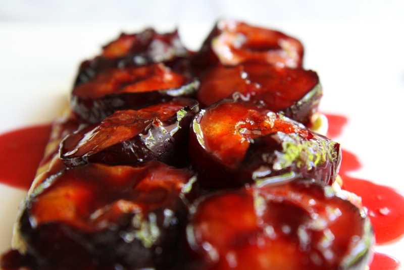This luscious tart marries gently roasted vanilla plums with a crisp puff pastry and a rich creamy filling. With the last of the season’s plums now available it seemed opportune to make this tart for an autumnal dessert. Find the recipe for the plums here, but you could also roast peaches or apricots the same way and make your tart using them. It’s appeal rests on simple but excellent ingredients and the combination of contrasting and complementary textures – creamy, crisp and sticky.